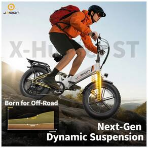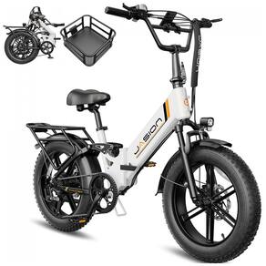 A bicicleta elétrica dobrável Jasion X-Hunter ST branca com cesto foi desenvolvida para adultos que buscam um modelo compacto com quadro rebaixado para deslocamentos urbanos, trilhas leves e uso recreativo em diferentes tipos de terreno. O quadro em alumínio com geometria step-through facilita subir e descer da bicicleta, enquanto os pneus largos 20 x 4 e a suspensão dupla contribuem para maior estabilidade e conforto em vias pavimentadas, estradas de terra, cascalho, neve e areia.
