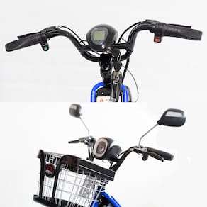 Painel digital em LCD com exibição de: indicador de nível de bateria, velocímetro, hodômetro, painel de tensão de bateria e parada (P)Acelerador na manoplaPedais: Pedal assistido (pedal system)Cesta dianteira com travaBanco ergonômico com molasItens inclusos: