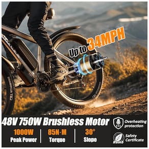 O motor poderoso de 750wpeak 1000W oferece ótimas habilidades de energia e escalada, com uma velocidade máxima de 34 mph