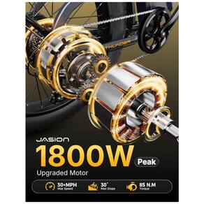 A bicicleta elétrica Jasion Thunder azul ártico é uma fat bike elétrica para adultos com pneus 26x4, quadro em alumínio e motor traseiro brushless de 750W de potência nominal e 1800W de potência de pico, indicada para uso em cidade, estradas de terra, neve, areia e trilhas leves. A bateria de íons de lítio de 48V 18Ah, com 864Wh de energia, é removível e recarregável, oferecendo autonomia de até cerca de 80 km em modos de assistência mais econômicos, variando conforme o nível de assistência, o relevo e o peso do usuário.