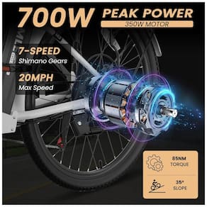 Bicicleta elétrica para adultos com motor de pico 700W, bateria removível 36V 10,4Ah e autonomia de até 64 km. Quadro em alumínio 6061, 7 marchas, tela LCD colorida e certificação UL2849 garantem desempenho, segurança e conforto em qualquer trajeto.