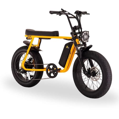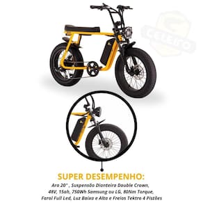 Um autopropelido (bicicleta com Acelerador e pedal assistido) que conta com um quadro em alumínio disponível em 5 lindas cores, suspensão dianteira double crown, vem com um potente motor de 750w de potência e 80Nm de torque, uma bateria de 48v, 15AH, 720Wh, freios Hidráulicos Shimano, transmissão shimano tourney de 7v mega ranger, Ciclocomputador LCD com 5 níveis de assistência, Acelerador no polegar direito, Farol Full Led, luz baixa e alta, buzina.