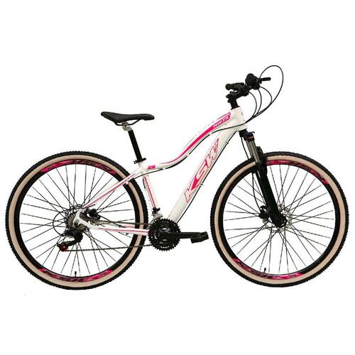 Bike Feminina aro 29, com quadro ksw mwza, nova na caixa a pronta entrega, produto com ótima qualidade e acabamento, possui 27 marchas com sistema de alavancas rapid fire que a cada clique uma marcha é trocada, Catraca do tipo k7 de encaixe com 9 velocidades, garfo com suspensão e sistema de Ajuste para melhor performance, sistema de freio a disco hidráulico, pneus com cravo baixo para uso em terra e asfalto. Bicicleta pré montada, vai precisar apenas fixar a roda dianteira, guidão, selim e pedais. Segue abaixo características da bike: Quadro Feminina 29 ksw mwza em Alumínio / Garfo 29 suspensão com Trava e Regulagem / Suporte do guidão em alumínio preto / Guidão 31.8mm em alumínio preto / Canote do selim 27.2 em alumínio preto Com carrinho / Selim Sport preto / Abraçadeira do Selim alumínio Preto / Aros Aero Parede dupla reforçado / Raios Pretos / Cubos Pretos Alumínio para K7 com blocagens / Pneus 29 Com Cravo / Movimento central selado rolamentado / Freios a disco Hidráulicos com discos inox 160mm / Alavancas Semi-automáticas Rapid Fire / Câmbio Traseiro Sunrun / Câmbio Dianteiro Index Importado / Corrente Index 9v / Pedivela Alumínio Triplo / Pedal Plataforma Nylon preto / Cassete K7 9v gta preto ou prata / Recomendamos que seja feita uma revisão por um técnico após a recebimento do produto, para reajuste e regulagem, pois no transporte pode acontecer de alguma peça soltar ou desregular / Fotos meramente ilustrativas