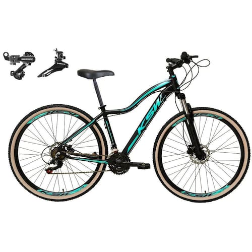 Bike aro 29 em alumínio, nova na caixa a pronta entrega, produto com ótima qualidade e acabamento, possui 24 marchas com sistema de alavancas rapid fire que a cada clique uma marcha é trocada, garfo com suspensão, sistema de freio a disco mecânico, câmbio dianteiro e traseiro Shimano Tz. Bicicleta pré montada, vai precisar apenas fixar a roda dianteira, guidão, selim e pedais. Segue abaixo características da bike: Quadro Feminina 29 ksw mwza em alumínio / Garfo 29 suspensão curso 60mm / Suporte do guidão em alumínio preto / Guidão 31.8mm em alumínio preto / Canote do selim 27.2 s/carrinho / Selim Sport preto / Abraçadeira do Selim alumínio Preto / Aros Aero Parede dupla reforçado / Raios Pretos / Cubos Pretos Aço / Pneus 29 cravudos / Movimento central selado rolamentado / Freios a disco Mecânicos com discos inox 160mm / Alavancas Semi-automáticas Rapid Fire / Câmbio Traseiro Index Shimano Tz/ Câmbio Dianteiro Index Shimano Tz Corrente Index 24v / Pedivela Aço Revestido / Pedal Plataforma Nylon preto / Roda Livre 8v index dourada(rosca) / Recomendamos que seja feita uma revisão por um técnico após a recebimento do produto, para reajuste e regulagem, pois no transporte pode acontecer de alguma peça soltar ou desregulas / Fotos meramente ilustrativas