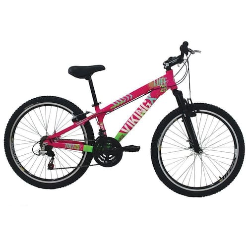 Bicicleta Freeride Aro 26 Freio V-Break 21 Velocidades Câmbios Shimano Rosa/Verde VikingX TUFF25 Foi projetada para quem quer uma bike de personalidade e estilo inigualável. Ela oferece ao ciclista quadro diferenciado e design arrojado e exclusivo. Com qualidade, ela vem equipada de com 21 velocidades, permitindo ao ciclista a escolha da marcha ideal de acordo com o . O design moderno pode ser observado no quadro da bike e os pneus são confeccionados em MTB com aro 26, garantindo total a cada manobra em qualquer tipo de terreno. Informações Técnicas: - Marca: VikingX - Modelo: MTB Freeride - Coleção/Sortimento: 2017 - Idade Recomendada: Juvenil/Adulto - Gênero: Unissex - Aro: 26 - Quadro: Alumínio - Marcha: 21 Marchas - Garfo: Suspensão - Guidão: Aço carbono MTB - Freios: V-Brake - Rodas: Aero - Câmbio: Shimano - Manoplas: MTB - Corrente: Index - Selim: WG - Trocador de Marcha: Grip -Shift - Pedivela: - Pneus: MTB 26" - Pedal: Plástico MTB - Conteúdo da Embalagem: 1 bicicleta e manual de instruções - Peso: 15,90 kg - Dimensões aproximadas da embalagem (AxLxP): 109 x 68 x 165cm - Garantia: 3 meses