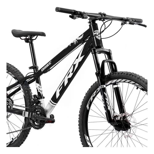 Descrições Marca: frx drake lançamento Aro: aero 26 alumínio comum Quadro: alumínio Cambio traseiro:importado Cambio dianteiro:importado Cubos: traseiro e dianteiro 36f sem blocagem Raio: 255mm Câmera de ar: 26 importada Pneu: 26x1.95 preto Selim: mtb importado Canote: 27,2 Abraçadeira: alumínio Mov. Central importado Mov. Direção: ahead set importado Pedivela: engrenagem tripla 24/34/42d Alavanca : 21v c/manete Suporte guidão: alumínio ahead set preto Guidão: 31.8 aço preto Roda livre: 7v index Câmbio traseiro importado Pedal: 9/16 plataforma de nylon importado Garfo suspensão: 29/26 over aço preto Freio a disco: dianteiro e traseiro mecânico