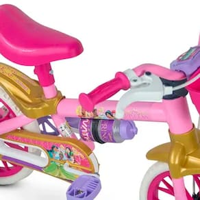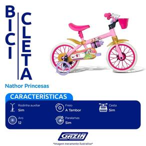 Características: Marca: Nathor Modelo: Princesas Aro: 12 Marchas: Não Material do quadro: Aço carbono Freio: Á tambor Pedivela: Monobloco 80mm Câmbio traseiro: Não Câmbio dianteiro: Não Suspensão: Não Cesta: Sim Paralamas: Sim Suporte para garrafas: Sim