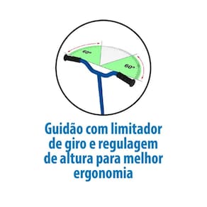 O novo quadro reforcado com guidao ajustavel e limitador de giro garante estabilidade e mais controle, enquanto o selim ergonomico com regulagem de altura cresce junto com a crianca. As manoplas emborrachadas dao o toque final, oferecendo uma pegada firme e confortavel para cada aventura no quintal, na praca ou na calcada.