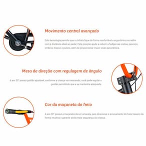 Bicicleta Infantil - Aro 20 - Bolt - Azul - Nathor: a Bicicleta Bolt Aro 20 é ideal para passeios e esporte. Conta com movimento central avançado (diferencial que ajuda na hora de pedalar, proporcionando um maior conforto). Tem freio v-brake e maçaneta em alumínio, que garante uma ótima rigidez, fazendo com que a frenagem seja mais eficiente. A Bicicleta Bolt também tem pezinho de descanso e protetor de corrente (diferenciais que levam muito mais conforto e segurança). As crianças vão se divertir muito com essa bicicleta infantil aro 20 Bolt com pezinho da Nathor! Detalhes: • Mesa Head-set • Aro em alumínio • Maçaneta com ajuste de freio • Movimento central avançado • Pezinho de descanso • Pneus com câmara • Freios v-brake (dianteiro e traseiro) Movimento central avançado: • Tecnologia permite que a criança fique de forma confortável e ergonômica no banco com a distância ideal ao pedal. A criança olha para frente com facilidade e ao parar, consegue facilmente apoiar os pés no chão Cor na maçaneta de freio: • A maçaneta direita é na cor amarela tornando o acionamento do freio traseiro mais intuitivo e garantindo ainda mais segurança Mesa de direção com regulagem ângulo: • A aro possui guidão ajustável, conforme a criança vai crescendo, você pode regular o guidão permitindo que a postura se mantenha adequada Informações: • Produto: Bicicleta Aro 20 Bolt • Marca: Nathor • Coleção: Bolt • Cores: Azul • Tipo: Bicicleta com rodinhas para crianças • Tamanho (C x A x L): 140 x 85.5 x 66 cm • Peso do produto: 10.600 kg • Tamanho da roda: 20 • Altura recomendada: 120 a 150 cm • Peso suportado: até 70 kg • Conteúdo: - 01 Bicicleta - 01 Manual • Idade recomendada: para crianças a partir de 07 anos de idade Especificações: • Referência: 101200160012 • Código de Barras: 7898322524150 • Embalagem (C x A x L): 120 x 22 x 54 cm • Embalagem (Peso): 12.200 kg • Material / Composição: - Quadro: Aço carbono - Aro: em alumínio - Pneus com câmara - Para-lamas: em ABS • Observação: o produto pode ter diferenças no modelo do aro dependendo do lote • Registro: CE-BRI/INNAC-00407-01A NM 301/2004 • Certificado: Órgãos Autorizados - OCP’S (Organismos de Certificação de Produtos Aviso: • As imagens são meramente ilustrativas • Os pesos, tamanhos e medidas são aproximados • As cores e estampas dos produtos podem ter variações • As informações são de responsabilidade do fabricante ou fornecedor