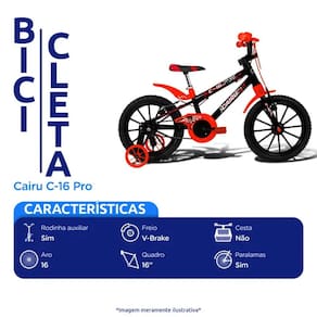 O passeio da criançada vai ficar muito mais seguro, estiloso e divertido com a Bicicleta Cairu C-16 Pro! Ideal para os pequenos aventureiros, o modelo possui aro 16, proporcionando uma pedalada confortável e ajustada ao tamanho da criança. Confira mais detalhes: