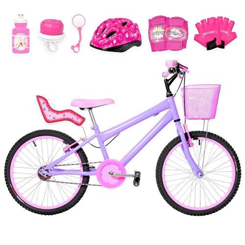 Bicicleta Infantil Feminina Aro 20 Alumínio Colorido + Kit Premium Cor Lilás E RosaABicicleta Infantil Feminina Aro 20 Alumínio ColoridoFlexBikesé a opção perfeita para garantir a diversão. Com design moderno e combinações de cores encantadoras, as meninas vão amar praticar exercícios físicos com essa bike que possui conforto e muito estilo!Conta com itens de certificados pelo Inmetro, banco (selim) macio e confortável, protetor de coroa e freios v-brake de alta frenagem. O modelo Alumínio Colorido é uma ótima relação custo-benefício para a bicicleta, com estrutura firme e resistente.Para auxiliar nas pedaladas, dispõe de rodinhas laterais e a opção de utilizar o descanso lateral que também acompanha o produto.A aro 20 é recomendada para crianças de 5 a 7 anos, pesando até 38 kg.Sobre o Kit PremiumSó na FlexBikes você encontra bicicletas infantis com umalinha completa de acessórios, para tornar ainda mais divertida e segura a experiência da criança ao pedalar.Confira o que está incluso noKit Premium Feminino:01 Garrafinha de água