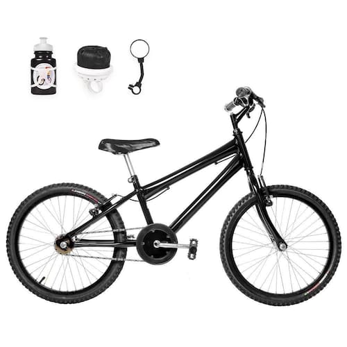 Bicicleta Infantil Masculina Aro 20 Alumínio Colorido + Kit Passeio Cor PretaABicicleta Infantil Masculina Aro 20 Alumínio ColoridoFlexBikesé a opção perfeita para garantir a diversão. Com design moderno e combinações de cores encantadoras, os meninos vão amar praticar exercícios físicos com essa bike que possui conforto e muito estilo!Conta com itens de segurança certificados pelo Inmetro, banco (selim) macio e confortável, protetor de coroa e freios v-brake de alta frenagem. O modelo Alumínio Colorido é uma ótima relação custo-benefício para a bicicleta, com estrutura firme e resistente.Para auxiliar nas pedaladas, dispõe de rodinhas laterais e a opção de utilizar o descanso lateral que também acompanha o produto.A aro 20 é recomendada para crianças de 5 a 7 anos, pesando até 38 kg.Sobre o Kit PasseioSó na FlexBikes você encontra bicicletas infantis com umalinha completa de acessórios, para tornar ainda mais diida e segura a experiência da criança ao pedalar.Confira o que está incl noKit Passeio:01 Garrafinha de água