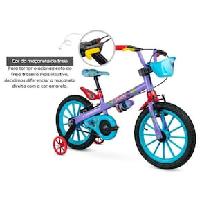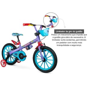 Bicicleta infantil nathor aro 16 com rodinhas stitch 2 Diversão e aventura com conforto e segurança a bicicleta aro 16 possui modelos com aro em abs e em alumínio. O limitador de giro evita que o guidão vire completamente, proporcionando mais segurança e preservando o freio. Para facilitar o aprendizado e a identificação do freio traseiro, a maçaneta amarela ganha destaque e indica o acionamento ideal na hora da frenagem. As rodinhas laterais permitem o desenvolvimento da criança na fase de aprendizado, estimulando o equilíbrio e a autonomia. A aro 16 tem pneus com câmara, quadro em aço carbono e garrafinha. Atenção: devido à variação de modelos de monitores, as cores podem variar com a cor real do produto. Características técnicas: Aro: 16 Modelo: stitch 2 Cor predominante: lilás e azul claro Faixa etária recomendada: a partir dos 5 anos Altura máxima recomendada: 1,10 m a 1,20 m Peso máximo recomendado: 30 kg Quadro, garfo e guidão em aço carbono Limitador de giro do guidão Freios v-brake com maçanetas em nylon reforçado e ajuste Mesa headset com regulagem de ângulo do guidão Rodinhas laterais Aro em alumínio ou aro em abs Para-lamas em abs Movimento de direção com Arruela com trava de segurança Pneus com câmara Abraçadeira do selim em alumínio Garrafinha Registro inmetro - ce-bi/innac 00407-01a nm 301/2004 Diferenciais: Cor da maçaneta do freio: durante a infância, a maioria das crianças não tem facilidade em diferenciar direita e esquerda, mas tem a atenção muito disposta em relação a cores. Para tornar o acionamento do freio traseiro mais intuitivo e garantir ainda mais segurança, decidimos diferenciar a maçaneta direita com a cor amarela. Limitador de giro do guidão: a bicicleta aro 16 possui um mecanismo que impede que o guidão gire além do necessário. O limitador evita acidentes, permitindo um pedalar com muito mais tranquilidade e segurança. Mesa do guidão com regulagem: a aro 16 possui guidão ajustável, conforme a criança vai crescendo, você pode regular o guidão permitindo que a postura se mantenha adequada. Medidas do produto: Peso: 9,5 kg Altura: 69 cm Largura: 53,5 cm Comprimento: 107 cm Medidas da embalagem: Peso: 10,6 kg Altura: 48 cm Largura: 24 cm Comprimento: 97 cm 7898322524662 Ean: 7891842919178