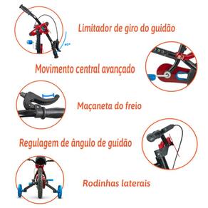 Características: - Quadro, garfo e guidão em aço carbono - Limitador de giro do guidão - Pneus em E.V.A - Cestinha - Mesa de direção em nylon reforçado - Selim com regulagem de altura - Freio dianteiro a tambor - Trava de segurança