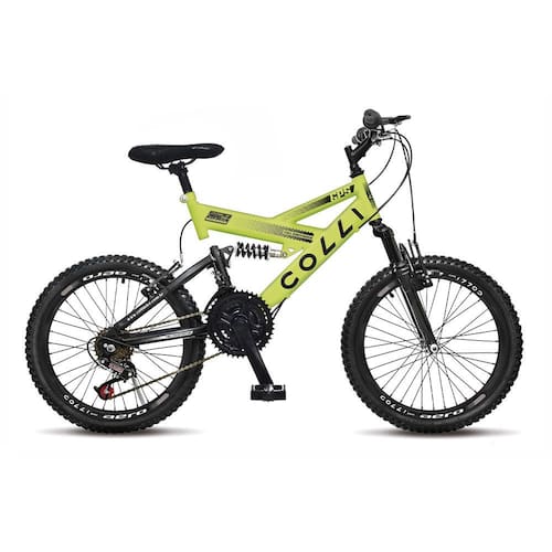 Características: Marca: Colli Modelo: GPS 20 Quadro de aço carbono que fornece força e leveza ao mesmo tempo. Aro: Aro 20 Aero Parede Dupla 36 raios Tamanho 14 Marchas: 21 velocidades Freio Tipo: V-Brake Dianteiro e Traseiro Suspensão: Dupla Dianteira e Traseira Pedivela: Triplo Pneus: Pneus e Câmaras de Ar 20 Pedal Rosca Grossa 9/16 Com Refletor Tipo de Guidão: Downhill Tipo de Manopla: Mirim Grip-shift com cabo 21 trocador na luva Corrente Fina 1/2 X 3/32 Roda livre 7V Descanso lateral: Sim