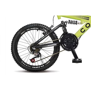 Construída com materiais de alta qualidade, como aço resistente e componentes robustos, esta bicicleta é projetada para resistir ao desgaste do uso frequente, garantindo uma longa vida útil. Possui aro Aero com parede dupla de 20, freios V-Brake, quadro fabricado em aço carbono de 14 e 21 marchas. Além disso, conta com dupla suspensão -dianteira e central- e câmbio dianteiro 28,6 puxa por baixo, que proporcionam mais conforto e segurança durante a pedalada.