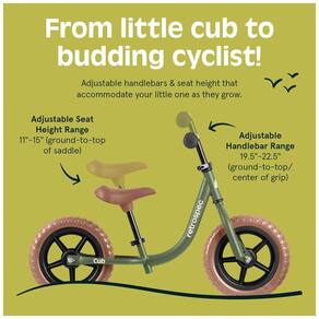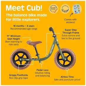 APRENDA A ANDAR CEDO As bicicletas de equilíbrio permitem que crianças de até 18 meses aprendam em seu próprio ritmo e ajudem a aumentar sua confiança em duas rodas. A estrutura estreita e discreta do Cub 2 é fácil para as crianças entrarem e saírem e as mantém em uma altura segura. ALTURA MÍNIMA DO ASSENTO DE Cub 2 é capaz de suportar crianças menores do que a maioria das bicicletas de equilíbrio para bebês. Seu assento e guidão ajustáveis foram feitos para crescer com eles. PNEUS SEM AR À PROVA DE FURO Esses pneus aderentes e sem ar são projetados para rolar com segurança e suavidade no pavimento sem o risco de serem perfurados e estourados. SEGURANÇA APROVADA PELOS PAIS Deixe seu pequenino aprender a andar com confiança Cub 2 tem todos os recursos de segurança que mantêm os pais felizes enquanto os pequenos estão explorando Marca: Não Informado