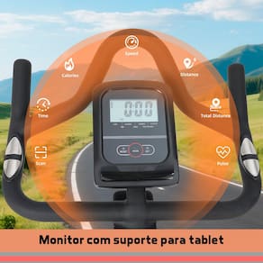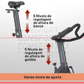CARACTERÍSTICAS Marca: Consport Conectividade: Connect Bluetooth Estrutura robusta e estável com pés antiderrapantes Roda de inércia: 13 kg Sistema de resistência: Mecânica com ajuste manual Transmissão: Correia Assento ergonômico ajustável (7 níveis, vertical e horizontal) Guidão regulável (5 níveis, vertical) com sensor de batimentos cardíacos Monitor digital multifunção com tempo, calorias, velocidade, distância, distância total, batimentos cardíacos e função scanner Pedais com sistema de encaixe SPD e ajuste de firmeza Movimentos suaves e silenciosos Rodinhas para transporte Suporte para garrafa e suporte para celular Pintura em ferro preto resistente Dimensões aproximadas: 112 x 53 x 125 cm Peso com embalagem: 42,5 kg Capacidade de carga: até 150 kg Ean: 7908529101273