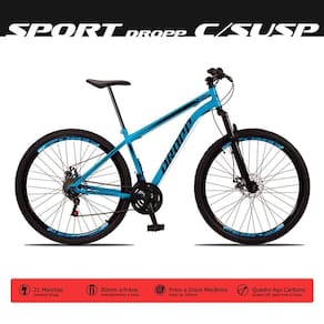 A Bicicleta Sport Aro 29 Quadro em Aço 21v com Suspensão e Freio a Disco Mecânico é a opção certa para você que pretende adotar um estilo de vida mais saudável. A Bicicleta pode trazer inúmeros benefícios para a sua saúde, além de uma qualidade de vida garantida. A Bike Dropp Sport é produzida em quadro ergonômico de Aço Carbono e possui e tamanhos para você escolher. Além disso este equipamento oferece um bom desempenho em área urbana e íngreme pois foi desenvolvida com componentes super importantes para uma boa performance, possui suspensão dianteira e também é capaz de combinar 21 velocidades com trocador Revoshift que facilita a troca de marchas para iniciantes do esporte. Este modelo é equipado com amortecedor dianteiro 80mm de curso para absorção de impactos. Já o freio a disco mecânico proporciona muito mais e tranquilidade nas frenagens. Invista em sua saúde mental e corporal, afinal pedalar é vida! Compre já!