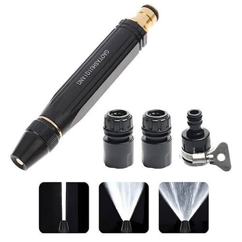 Características do Produto: - Cor: Preta; - Material: Liga de alumínio; - Função: Ajustável para jato de alta pressão ou pulverização leve; - Aplicações: Lavar carros, quintal, jardim, regar plantas; - Compatibilidade: Não utilizar em torneiras de baixa pressão ou máquinas de lavagem a jato; - Vedação: Anel de borracha e bocal rosqueado para evitar vazamentos; - Nome: Bico de Pressão 3 em 1.
