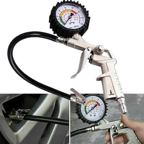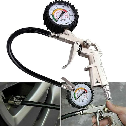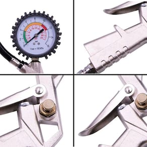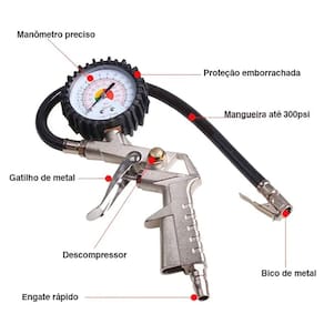Bico de Ar Calibrador Pneu Com ManômetroBico de Ar com Manômetro, produto de alta qualidade para calibrar, encher pneu, e realizar limpeza com ar em superfícies de difícil acesso.- Escala PSI e BAR- Prático e funcional- Bico prendedor de metal com trava- Tubo de cloreto de polivinila- Capacidade: 220 psi - 16 BAR- Com inflador e manômetro blindado para compressor com reservatório.PRINCIPAIS CARACTERÍSTICAS- Gatilho para inflar e botão para alivio de pressão em metal- Manômetro para aferição de pressão de polipropileno e poliestileno.- Calibrador com gatilho para fazer medição na mão, direto no pneu, com opção de encher ou esvaziar.Marca: LorbenCor: Prata/PretoPeso: 329gDiâmetro do manômetro: 75mmComprimento da mangueira: 350mmCódigo do produto: GT6057Imagens ilustrativas. As tonalidades podem variar.