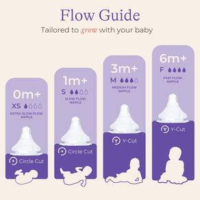 - Fluxo de leite que eles controlam – Nossos bicos de mamadeira permitem que o bebê faça o trabalho ao se alimentar. A ponta flexível estica e comprime para que seu bebê controle o fluxo de leite, dando a ele a quantidade certa de leite em seu próprio ritmo