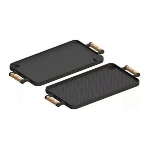 Chapa ferro fundido dupla face com alça de madeira 26x48cm - fundição libaneza Instruções de uso: Este utensilio já sai de fábrica pré curtido para uso, entretanto recomendamos antes do primeiro uso: lavá-lo com água quente e sabão. Untá-lo com gordura ou óleo de cozinha. Levá-lo ao fogo por 3 minutos. Não esfregar com esponja de aço. Em seus primeiros usos guarde-o untado Ficha técnica - Comprimento: 48 cm - É kit: não - Com superfície canelada: Sim - Modelo: Bifeteira Dupla Face - Marca: Libaneza