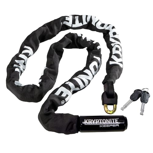 Kryptonite Keeper 712 Cadeado de corrente de bicicleta, 1,2 m de comprimento, antifurto, antifurto, com chaves para bicicleta, motocicleta, scooter, bicicleta, porta, portão, cerca, preto - Corrente resistente: feita de aço temperado de 7 mm com elos de quatro lados, esta trava de bicicleta oferece máxima resistência contra ataques de corte e alavancagem - Sistema de bloqueio patenteado: possui um cilindro estilo disco de alta segurança, resistente a coleta e perfuração, e um design de elo de extremidade patenteado que conecta com segurança a corrente a uma fechadura endurecida, eliminando pontos fracos - CARACTERÍSTICAS DE PROTEÇÃO: O revestimento de borracha durável ao redor ajuda a evitar arranhões e desgaste em sua bicicleta. A manga de nylon durável e resistente ao clima evita arranhões - Design durável: a corrente integrada Keeper 712 se estende até 120 cm de circunferência, feita de elos de aço endurecido de 7 mm. Cadeado de bicicleta resistente pesa 1,70 kg. Inclui duas chaves e classificação 5/10 para segurança moderada em nossa escala. - Programa de segurança para chaves: a Kryptonite enviará suas primeiras 2 chaves gratuitamente, globalmente, caso você as perca. Registre seu código de chave exclusivo em nosso site para que você possa pedir novas chaves se você perdê-las - Proteção antifurto opcional: elegível para a oferta de proteção anti-roubo (ATPO) da Kryptonite até US $500 para fechaduras registradas - Garantia vitalícia e suporte: a Kryptonite oferece uma garantia vitalícia limitada para tranquilidade. Se você tiver algum problema, com nossa equipe de experiência do cliente e resolveremos isso rapidamente. Estamos comprometidos com a sua satisfação e qualidade do produto