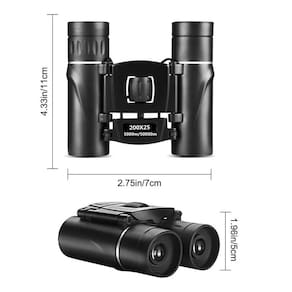 especificações: tipo: binóculos modo: 200x25 material do corpo: liga de alumínio + reciclar borracha + pvc/abs ampliação: 10x diâmetro do ocular: 10mm diâmetro da lente objetiva: 22mm prisma: bak4 revestimento de lente: fmc sistema de foco: foco central campo de visão: 5000m/50000m ângulo de visão: 7. 5 graus visão noturna: baixo nível de luz cor: preto tamanho: 11x5x7cm peso: 250g