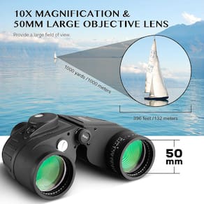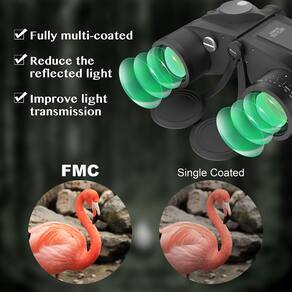 - Bússola iluminada embutida para localização de direção, perfeita para condições de pouca luz, e um telêmetro para calcular diretamente a distância e o tamanho do objeto na ocular esquerda. Os binóculos marinhos perfeitos incluem baterias, uma régua e uma bússola iluminada pelo botão de luz, fornecendo o brilho máximo da imagem mesmo em condições de pouca luz (não totalmente escuras), como ao entardecer e ao amanhecer.