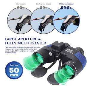 - O prisma BAK4 de alto índice fornece uma imagem clara e nítida para oferecer todos os pequenos detalhes de um objeto. O revestimento antirreflexo verde FMC reduz a luz refletida na lente objetiva e melhora a transmissão da luz, o brilho e a nitidez da imagem. A lente objetiva de 50 mm e a ocular de 22 mm com uma combinação de visão de grande angular são mais convenientes para ver objetos distantes sem cansaço visual e tontura.