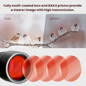 -?Lente objetiva grande de 80 mm?: O campo de visão é mais amplo com lentes grandes de 80 mm do que com 70 mm. Em situações de pouca luz e de longo alcance, lentes totalmente multirrevestidas de 80 mm e prismas BAK4 garantem maior transmissão de luz, proporcionando vistas cristalinas com maior contraste e menos erros de cor e distorções.