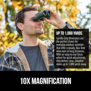- MAGNIFICAÇÃO 10X: os binóculos Gorilla Grip oferecem uma visão detalhada e de perto de objetos a até 1.000 metros de distância, com uma imagem clara e estável; a roda de foco rápido permite ajustes fáceis