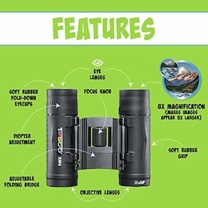 A Tasco Kids cria equipamentos ao ar livre de alta qualidade para que as crianças possam sair e aproveitar o ar livre, esteja você explorando, acampando, caminhando ou até mesmo observando pássaros. Estes binóculos leves e de alta qualidade são fáceis de usar para todas as idades e são feitos com lentes totalmente revestidas para imagens claras e brilhantes. Disponível em preto, azul ou rosa.