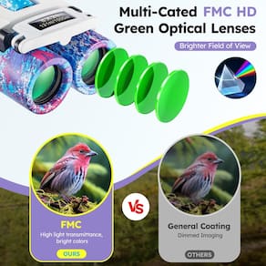 - Revestimento verde multicamada completo FMC: com revestimento verde multicamada completo FMC, esses binóculos maximizam a transmissão de luz, reduzindo os reflexos e garantindo imagens nítidas e vibrantes com o mínimo de distorção de cor