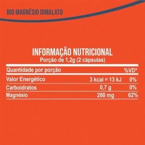 Valor energético: 3 kcal = 13 kj 0% Carboidratos: 0,7g 0% Magnésio: 260mg 62% VD Recomendação de uso: Ingerir 2 cápsulas ao dia.