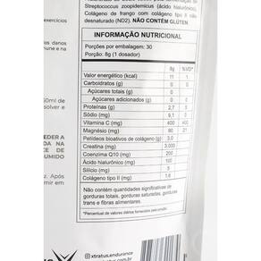 Ingredientes: creatina monohidratada com 99,8% de pureza, Peptideos bioativos de colageno hidrolisado com peso molecular medio de 2 kDa Verisol , Acido ascorbico vitamina C , Malato de magnesio, Acido ortosilicico estabilizado em maltodextrina silicio organico , Coenzima Q10, Hialuronato de Sodio obtido pela fermentacao de Streptococcus zoopidemicus acido hialuronico , Colageno de frango com colageno tipo II nao desnaturado ND2 . Marca: Xtratus