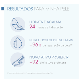 Sua fórmula conta com ativos, como Vitamina C Glicosada, Vitamina E e Niacinamida que promovem um efeito de luva, formando um filme protetor de longa duração para manter a pele hidratada e protegida. Além disso, possui ingredientes que fortalecem as unhas de forma duradoura.