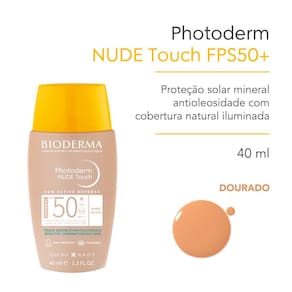 PROTETOR SOLAR PHOTODERM NUDE TOUCH FPS 50+ COR DOURADO Para pele mista a oleosa. Efeito uniformizador. A associação exclusiva de filtros dermatológicos 100% minerais UVA/UVB proporciona muito alta pr