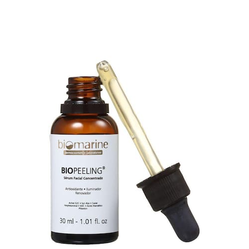 Sérum Redutor de Linhas clareador para todos os tipos de pele. Biomarine Biopeeling Sérum Facial Concentrado reduz a aparência de rugas, linhas finas e manchas. Além disso, aumenta a firmeza e elasticidade da pele.