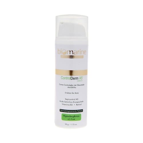 Biomarine Control Derm A5 Controle de Oleosidade promove a redução das imperfeições: relevo irregular, poros dilatados e excesso de brilho. Formulado com Sepicontrol A5, um ativo antiacneico com ação sinérgica sobre as 5 principais causas do desequilíbrio das peles oleosas: a 5-Alfaredutase, enzima responsável pela produção de sebo; a proliferação bacteriana; a Lipase, que é secretada por P. acnes com ação comedogênica e capaz de desenvolver inflamações; a Elastase, que é responsável por romper os tecidos estruturais e formar cicatrizes; e os Radicais livres, que desencadeiam a cascata inflamatória. Sua fórmula conta com Ácido Salicílico encapsulado, que auxilia na desobstrução dos poros; Vitamina B3, que garante um aspecto iluminado à pele e apresenta ainda ação anti-inflamatória; e Retinol, que age no processo de renovação celular. Biomarine Control Derm A5 Controle de Oleosidade é um controlador de oleosidade e hidratante antiimperfeições que reduz visivelmente o brilho, deixando a pele mais lisa e uniforme. Proporciona um toque seco imediato devido aos seus ativos matificantes. Ideal para o uso diário. Hipoalergênico.
