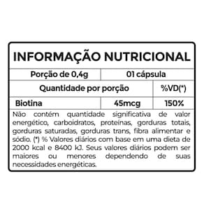 Ingredientes: Óleo de girassol, D-biotina, glaceante cera de abelha e emulsificante lecitina de girassol. Composição da cápsula: gelatina, água purificada, umectante glicerina e corantes clorofila e dióxido de titânio. NÃO CONTÉM GLÚTEN.