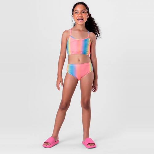 Estilo e proteção ao sol com o biquíni infantil menina beach wear composto por top e calcinha em malha UV de alta qualidade proporcionando uma camada extra de proteção contra os raios solares, garantindo que sua pequena aproveite o sol com segurança. O top possui alças finas com X nas costas, decote canoa frontal e estampa rotativa foil, já a calcinha também com estampa rotativa foil. Aposte!