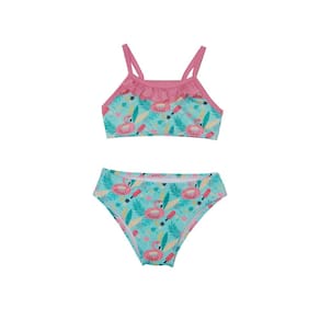 O biquíni infantil para meninas com estampa de flamingo é uma ótima opção para moda praia.