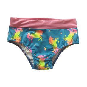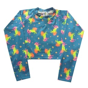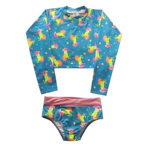 O Biquíni Infantil Cropped Azul com estampa de unicórnios em neon é perfeito para as meninas aproveitarem os momentos ao sol, seja na praia ou piscina. A calcinha possui barrado rosa na cintura, que realça o modelo e o look. Possui Proteção UV 50+ para máxima segurança contra os raios solares.