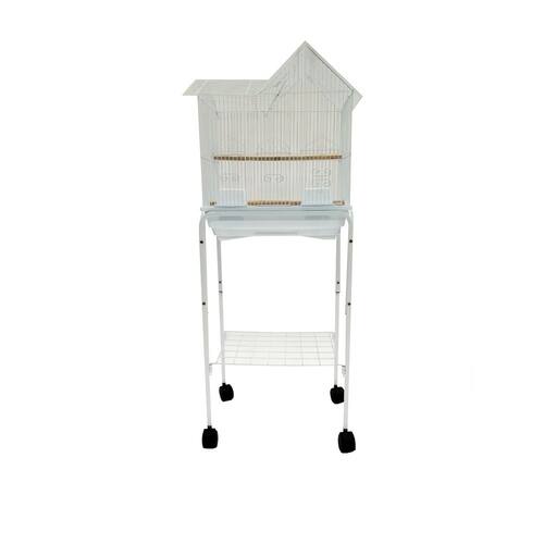Gaiola para pássaros no topo de uma vila pequena com espaçamento de barra de 3/8" em branco. Ele vem com porta elevatória, 2 portas de alimentação, 2 xícaras e 2 poleiros, caixa de metal removível e bandeja plástica inferior deslizante. A dimensão da gaiola é 16L"x12D"x20H”. Com suporte 18x18