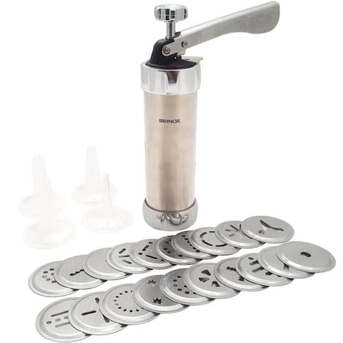 DescriçãoBiscoitinhos são bem-vindos em qualquer hora do dia, vai bem na hora do café, depois das refeições e para diminuir aquela fome repentina. A Máquina de Biscoito Manual Brinox Verona é puro charme, com seu design clássico e ótimo acabamento em inox, você pode preparar até 20 formatos diferentes de biscoitos e decorar com até 4 diferentes desenhos. Faça deliciosos biscoitos com gostinho caseiro e com os seus ingredientes preferidos e livres de conservantes. Contém:20 opções de moldes4 Bicos de decoraçãoMáquina de Biscoitos:Tamanho: 21 x 15,5 x 5,5cmComposição: Biscoiteira: Aço InoxMoldes: Alumínio