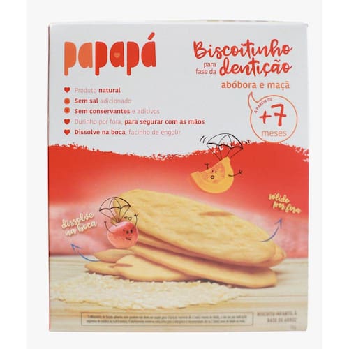 Os biscoitinhos para dentição são 100 por cento naturais pensados para bebês a partir dos sete meses que estão passando pela fase em que seus dentinhos estão nascendo. Sua textura é durinha por fora para o o bebê coçar a gengiva, mas dissolve na boca para evitar o engasgue, o que o torna facinho pra engolir. Produto natural, sem glúten, sem lactose, sem conservantes e sem aditivos, definitivamente feito para bebês. Biscoito para fase da dentição infantil natural com sabor à base de arroz abóbora e maçã sem glúten sem adição de sal. A caixa de Papapá biscoitinho para fase de dentição contém 2 bisnagas totalizando 36g. Sabor Maçã e Abóbora. Ean: 7898994908777