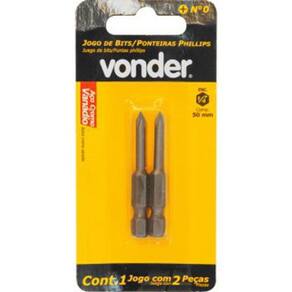 Bits phillips voder lg enc1/4 n0 50mm c/2pc vonder 1 cartela com 2 bits/ponteiras phillips Indicado para apertar e soltar parafusos com cabeça fenda cruzada phillips . Utilizado em parafusadeiras e suportes manuais. Produzido em aço cromo vanádio, proporcionando maior resistência e durabilidade. Conta com acabamento jateado, que proporciona ótima proteção contra oxidação. Também possui corpo rebaixado, que possibilita o uso em locais de difícil acesso. Material do bits ponteira: Aço cromo vanádio Comprimento total do bits phillips: 50 mm Número da ponta do bits phillips: Nº 0 - 1/8 Tipo do encaixe do bits: Sextavado - 1/4 6,35 mm Acabamento do bits: Jateado cdc : legal: 90 dias Ean: 7893946555740