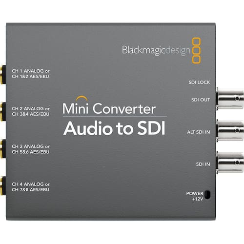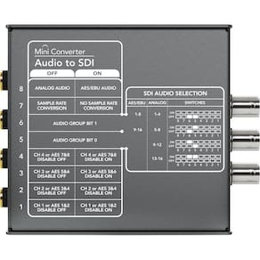 Incorpore áudio em fontes 3G/HD/SD-SDI em resolução de até 1080p60 com o Audio to SDI Mini Converter da Blackmagic Design . Conecte até quatro canais de áudio analógico balanceado ou oito canais de áudio AES/EBU por meio de quatro conectores de 1/4".